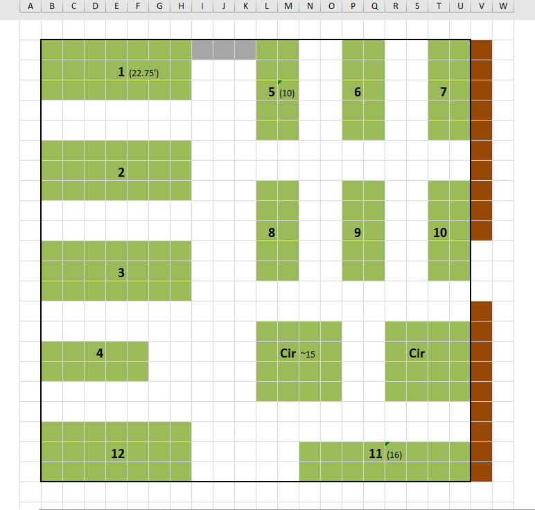 The black line shows the 20’x22′ space that has been fenced off for the vegetable garden. The grey boxes at the top represent the door. Green squares are the rough shape of where the garden boxes will go. The white boxes will be covered in cardboard and a thick mulch.