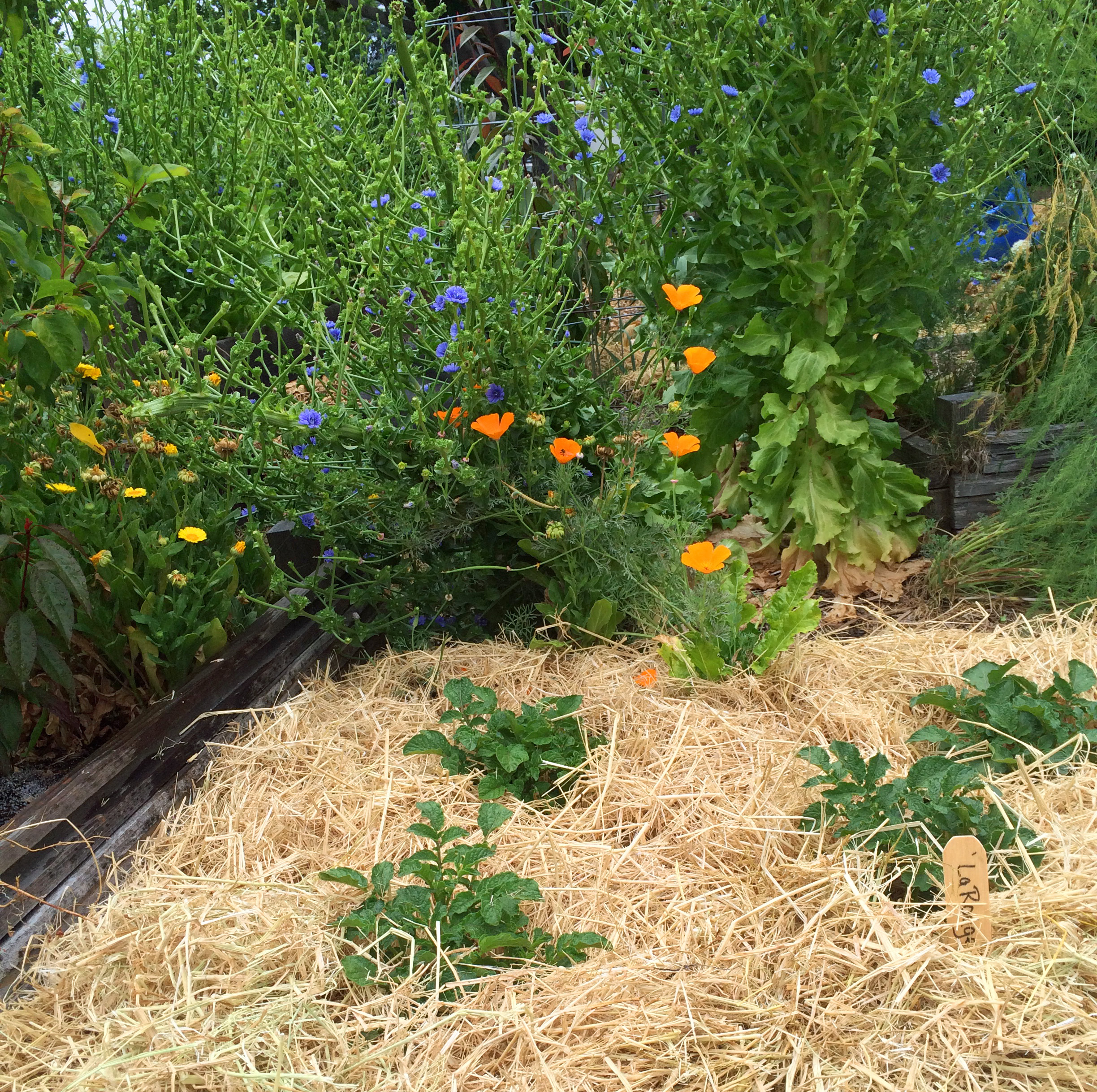 I am also surprised and pleased by how well the potatoes are doing with very little water in their tall beds of straw. Potatoes probably should not be your first choice as a sustenance crop in an arid climate, but I love them and started them as early as possible this year to take advantage of what moisture was available while the weather was still cool and as of Memorial Day weekend, I have to say I am encouraged. The soil around the stems is dry and dusty, but the plants look healthy and have moved through their Sleep, Creep, and Leap stages pretty much on-time. The ‘Ozette’ fingerling potatoes in the back garden are slower-growing than I would like. I don’t know if that’s the variety or the conditions. Since they are often referred to as the oldest variety in commercial cultivation, I am willing to bet they are widely adapted and will do their best in their mulch pile on their own schedule.