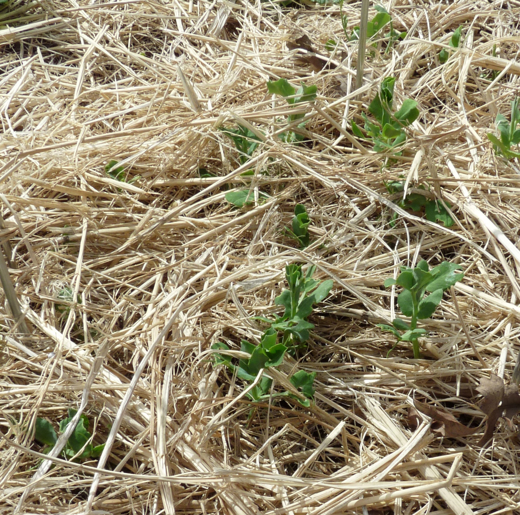 #9. The slugs didn’t decimate the last patch of ‘Sugar Daddy’ peas. They were hiding out under straw and have made it to the point where they each have several leaves before anything found them and chewed them to nubs.