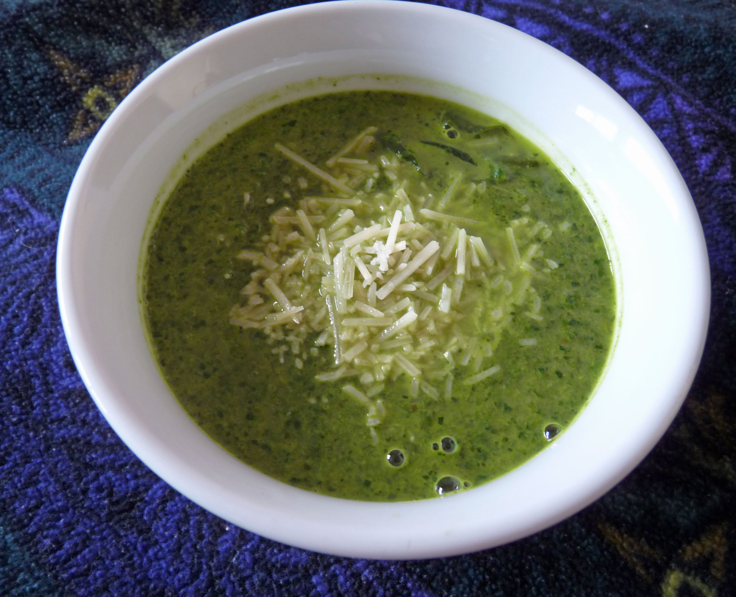 With the kale wilted but still a nice bright green, I turned the soup down to Low and processed batches of it in the food processor until it was a lot smoother, but still a bit chunky. If you want more of a cream of kale soup, process until smooth. The finished product called out to me for a dusting of nice Parmesan. Sadly, not local, but I have to admit it was delicious. A dash of hot pepper might be tasty. I plan to try that in my next bowl. Enjoy!