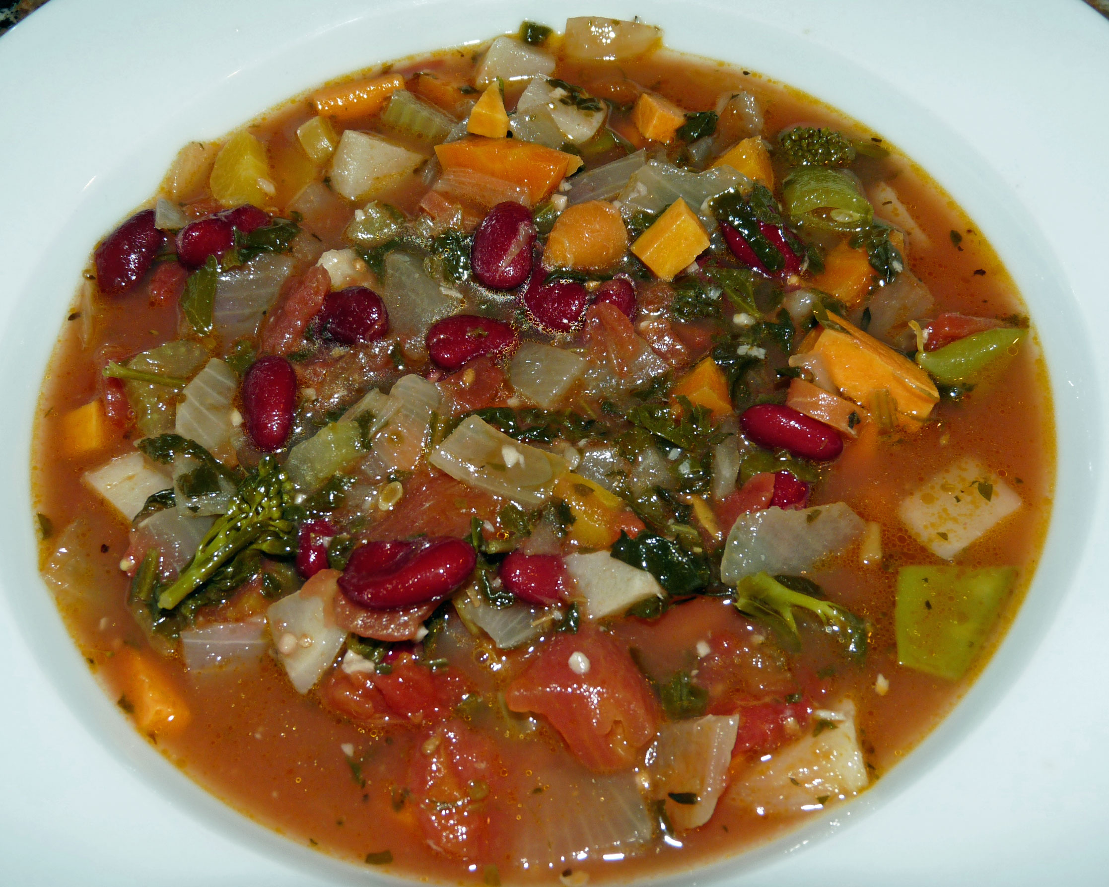 I started with the traditional olive oil, carrots, onions and celery in the big stock pot and added in the rest of the root vegetables as I chopped. I also had some potatoes that needed to be used and I tossed in some sweet potato, trying not to waste that either. When the vegetables started to soften, I added in some chopped garlic. A few minutes later, I added two cups of chopped tomatoes, with the juice, half a cup of cooked kidney beans, the herbs, salt, pepper and four cups of chicken stock.