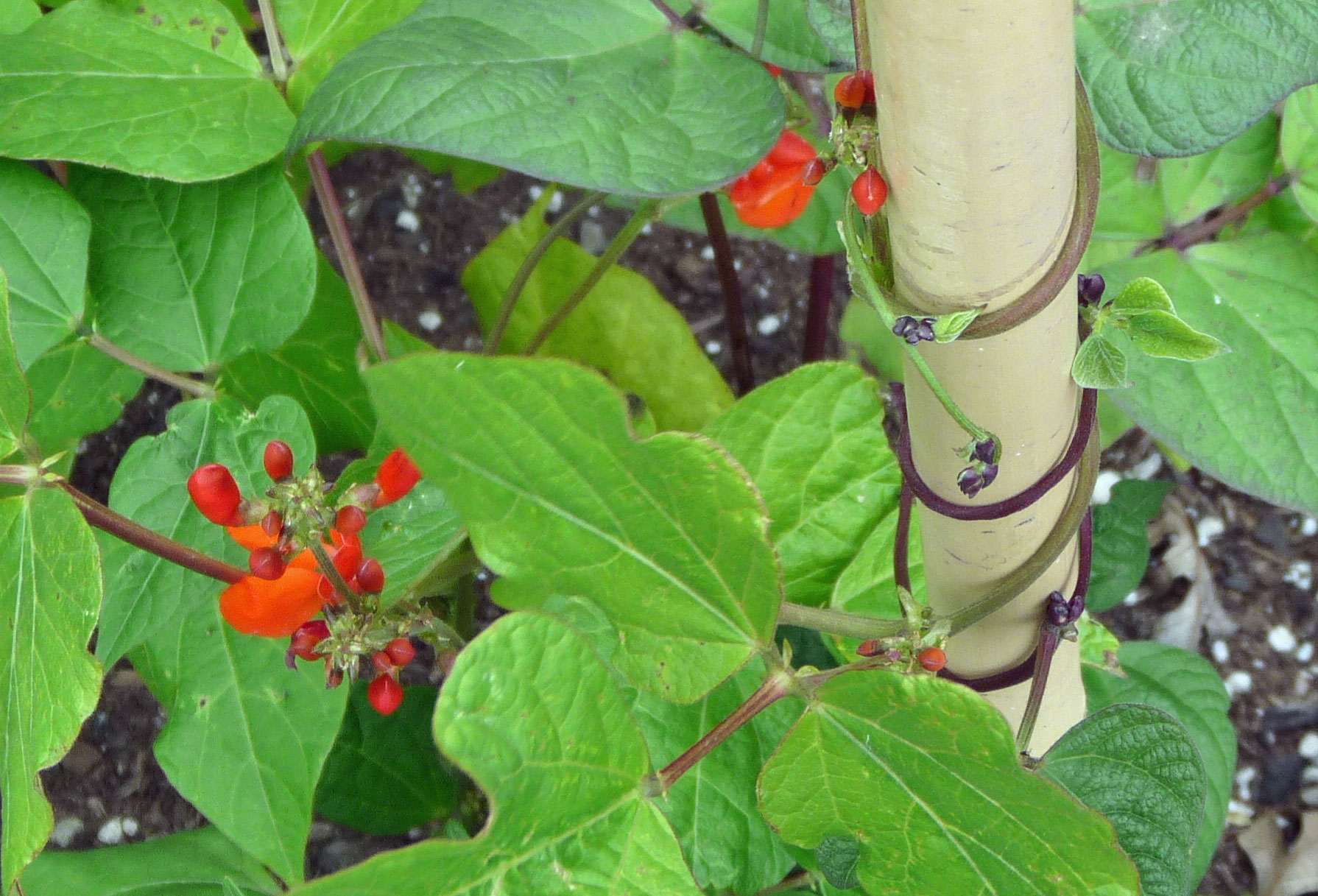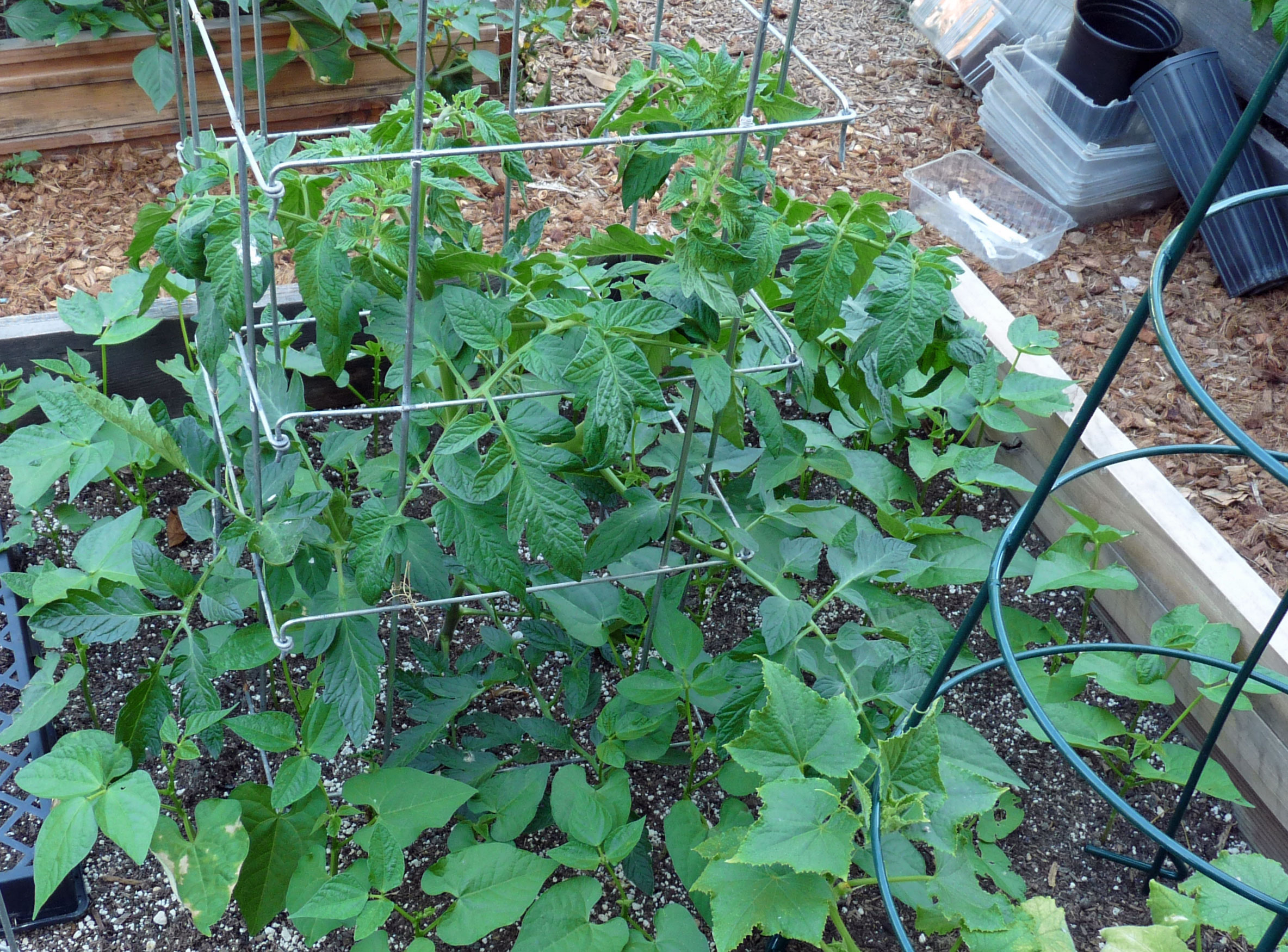 The smallest of the seedlings died and the others lost several of their leaves. In the regular bed, that is. Both plantings were lightly mulched with straw before germination and then more straw was added to retain moisture after the seedlings were up. This was not enough to sustain the beans planted in my usual soil mix very well through the drought. And the Soil Reef patch? A leaf or two was lost there as well, but the plants are bigger, greener, and much more vigorous.