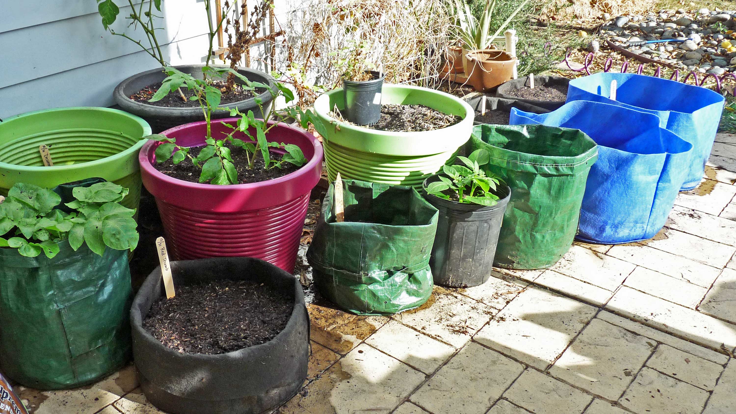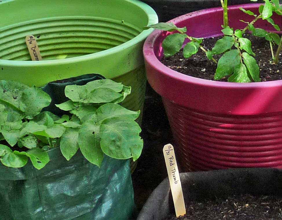 Conatiner grown winter potatoesThe first group of patio container potatoes were started October 30th, so they have been out there  nine weeks already. The potatoes in the green grow bag that are already leafing out nicely are ‘Amey Russet’ potatoes grown from potatoes I saved in 2011. This variety originally came from Tom Wagner at New World Seeds and Tubers. The leggy variety in the purple-ish container may be ‘Caribe’, though I won’t be really sure until we harvest them. The label must have slipped down into the container when I was adding soil mix. The black gallon container is growing an earlier planting of the mystery blues. I used the restrictive container because I am hoping to get lots of small potatoes for planting in the spring.