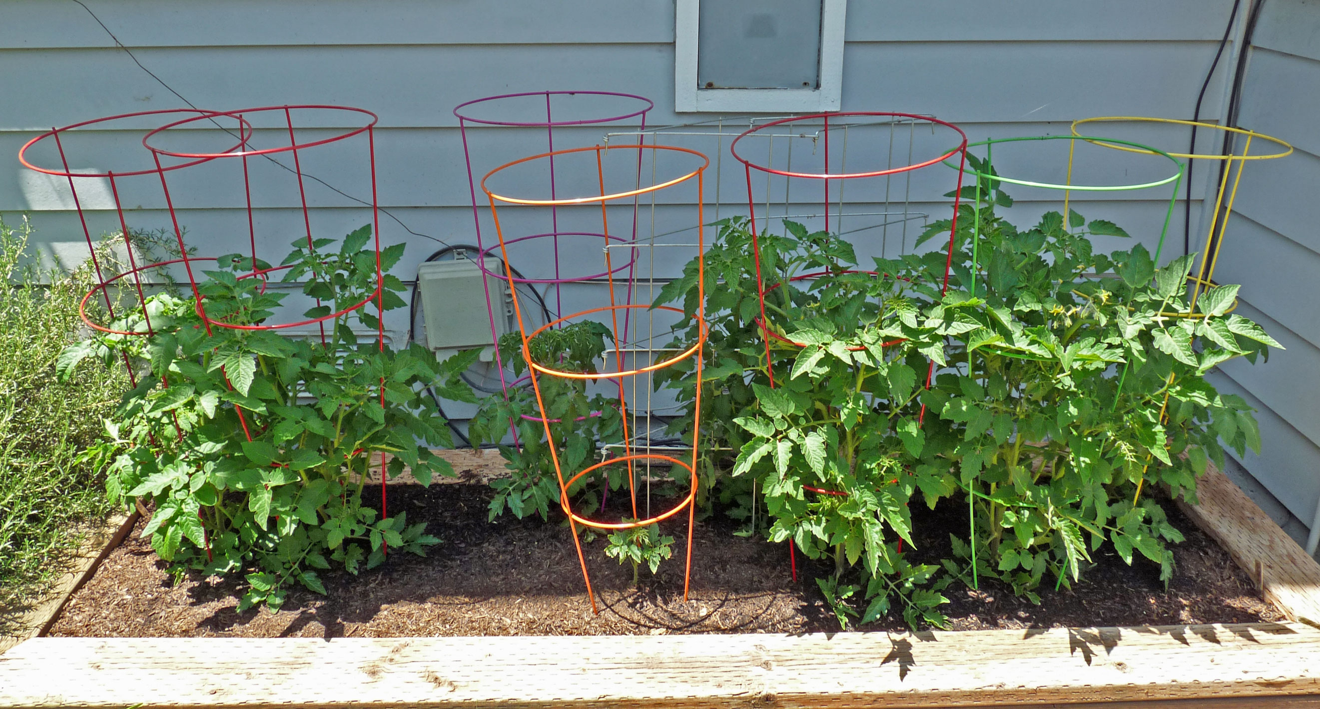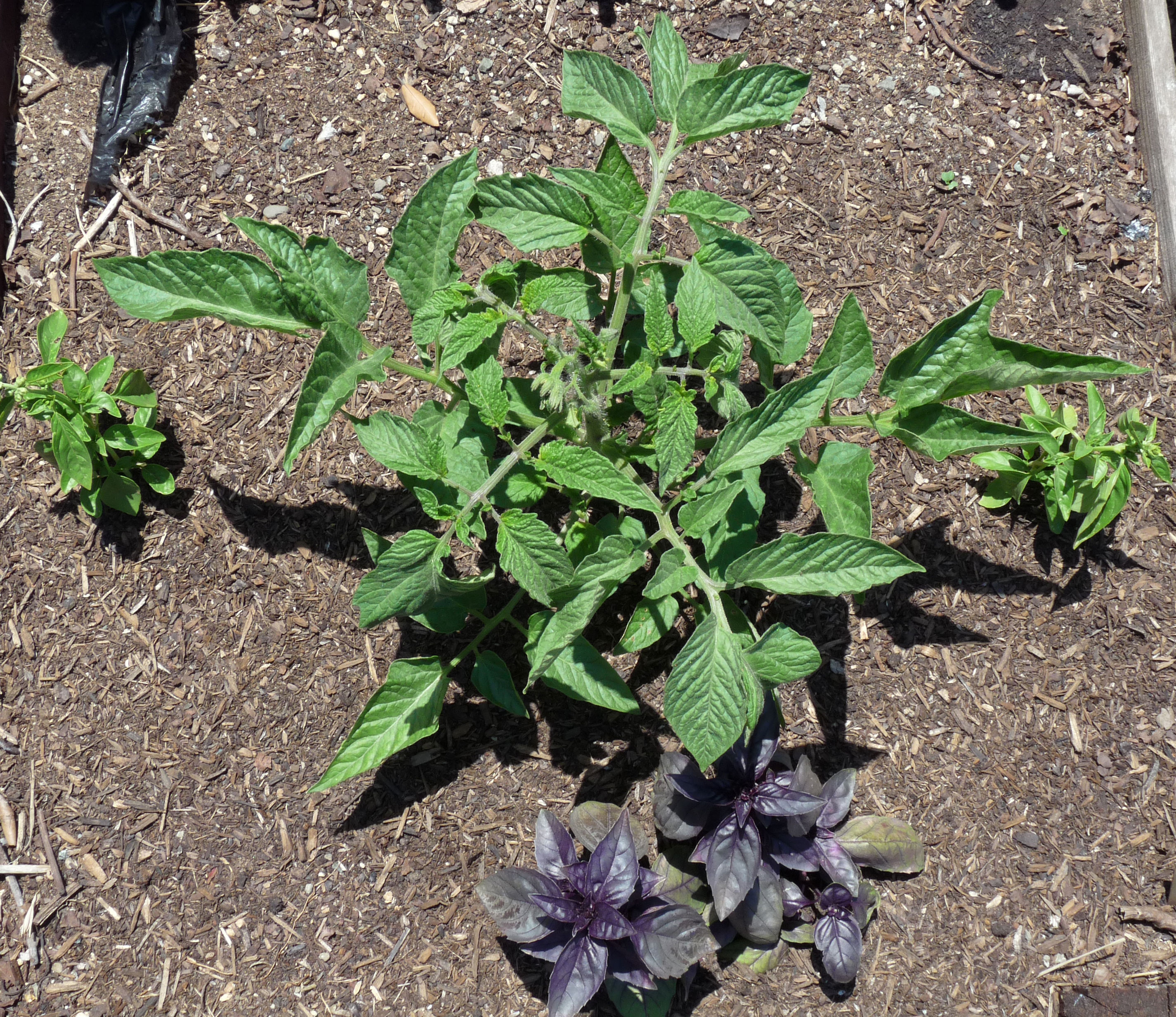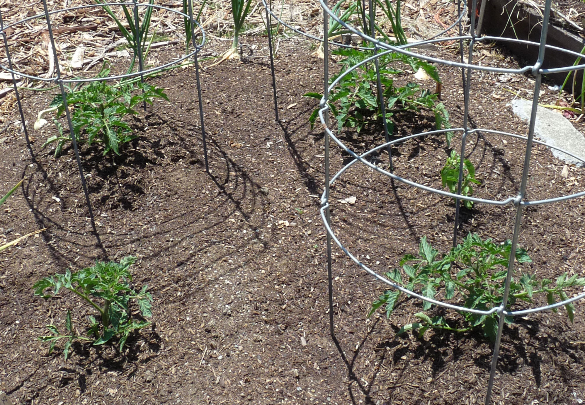 The first tomatoes into the ground this year were the ‘Principe Borghese’ drying tomatoes, four of them started from Bountiful Gardens seed, four from Victory seed. Six of the plants are doing very well, flowering and just beginning to set fruit. Two, one from each seed company but both planted in the same section of the bed, are smaller and less robust. They don’t appear diseased or I would pull them out rather than risk the other plants. If you have a guess as to why they are so much slower than their buddies, I’d love to hear it!