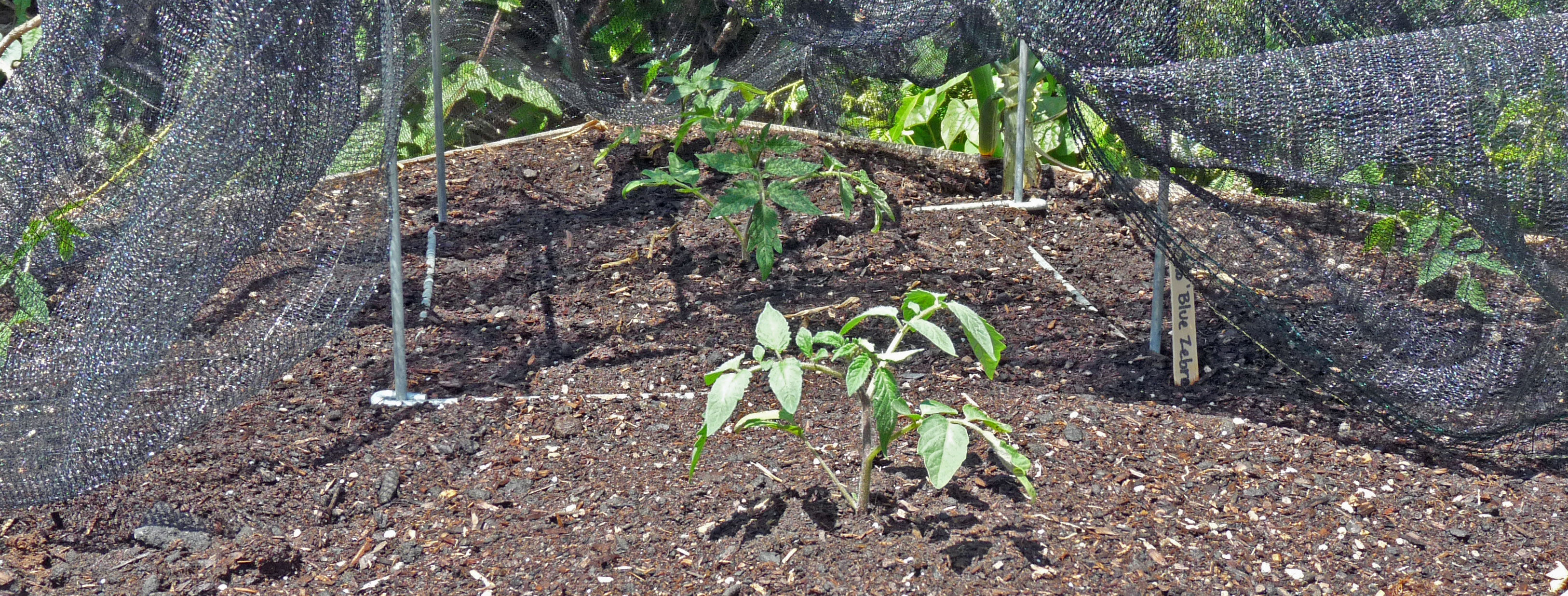 We are also growing out five seedlings from Tom Wagner’s ‘Search for the Blue Zebra’ which we will compare with his ‘Green Zebra’ and ‘Black Zebra’ grown from Boondockers seed. These seedlings, just planted yesterday, are covered with 30% shade cloth for the first few days as they acclimate to the new garden bed. I have no idea what the Blue Zebra’s will be like. They may not be blue and they may not have stripes, but it’ll still be fun to see what we will get.