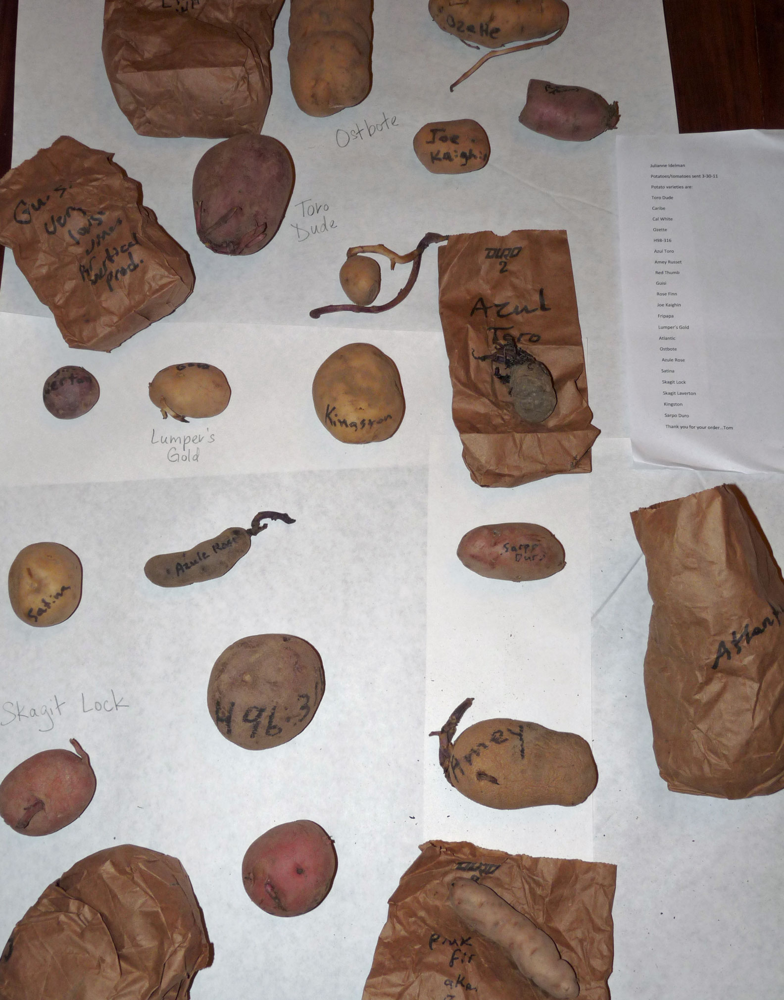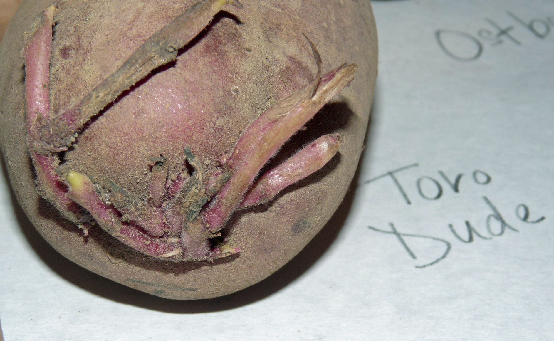 Other known varieties of potatoes currently in the ground in the garden include ‘Amey Russet’, ‘Rose Gold’, ‘Red Thumb’ and ‘Harlequin’. I’m also nursing along four different potato seedlings grown with TPS from a ‘Toro Dude’ mother. We’ll see if any of them make it through to tuber production. I started with ten seedlings and I’m already down to 40%. They are growing in pots that I set outside during the day and bring inside at night. If any of these tiny plants produce a tiny tuber, I’ll try growing it out this spring to produce enough tubers for tasting. If one of them does well and tastes good, we’ll have a whole new variety to propagate.