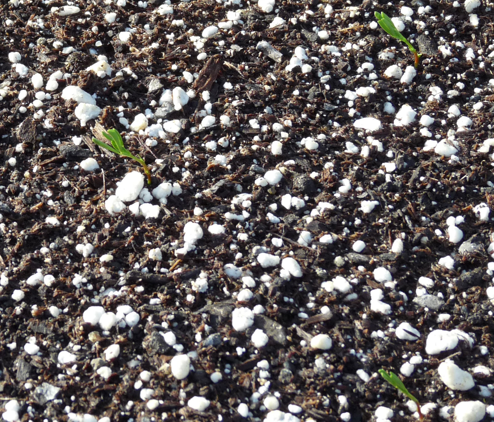 Another wonderful surprise was seeing how well the lentils have sprouted. In our family, my mother-in-law is a legendary cook. If you want to get the kids to try something new, all you have to do is tell them, “Grandma Susan made it,” and they head to the table salivating. Our youngest is especially partial to Grandma’s lentil soup, which is made with the small ‘French Green‘ lentils that look like little grey rocks. When I saw these available through Bountiful Gardens, I had to try growing some. And the sprouts look healthy so far. French Green lentils are supposed to like cool weather, unlike the Asian varieties that are a lot prettier, if you ask me. But what really matters is how they taste in that soup!