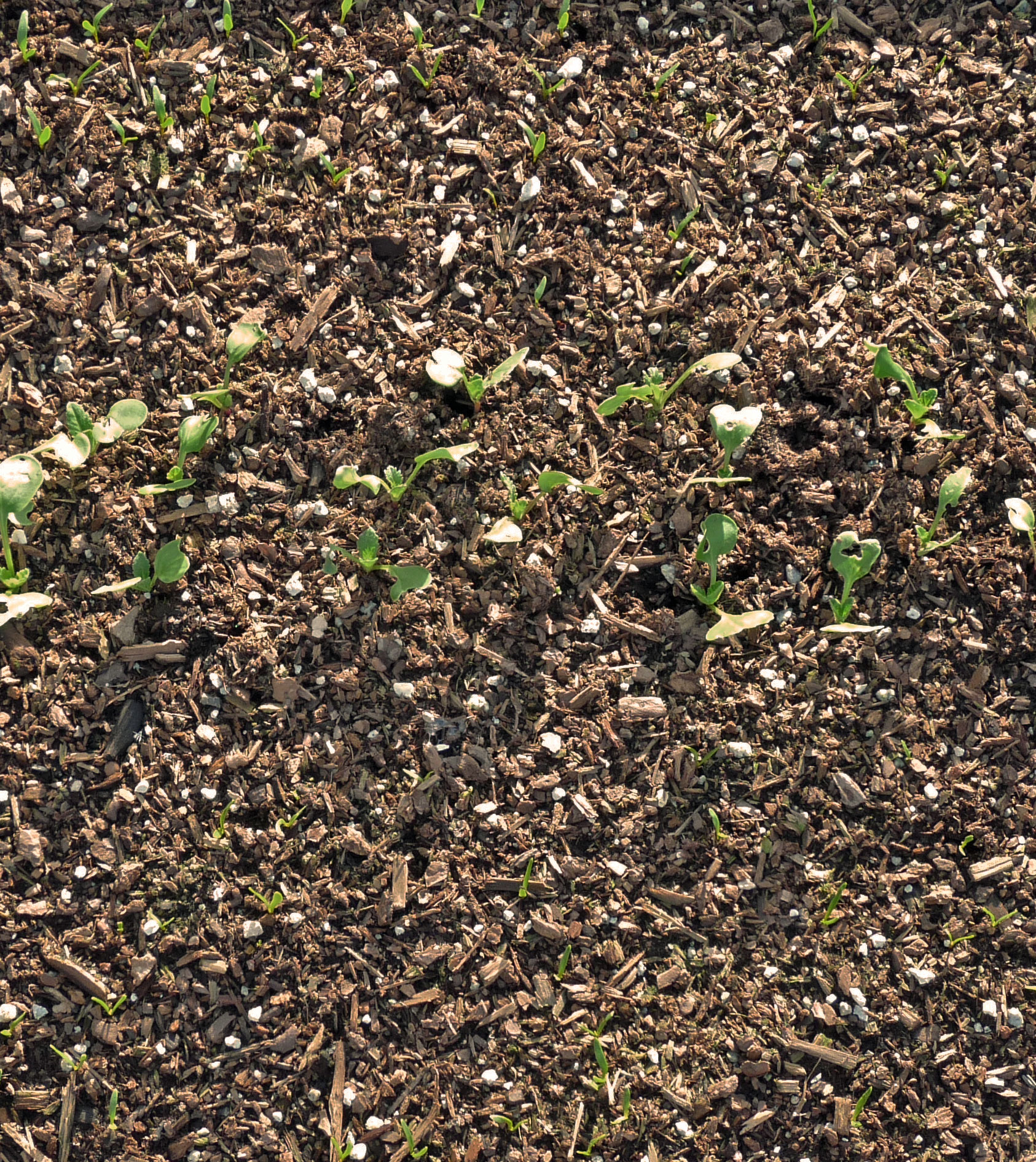 We’ve also got some Rat-Tailed Radishes and two small sections of Golden Beets coming up nicely–for once! Germination for Golden Beets here has been a fraction of what we get for the red beets we grow. And I honestly don’t know why. Maybe the red beets do better in warmer weather and the golden ones need cooler temperatures to germinate well? I’ll keep experimenting because I love golden beets and this is the first time I have gotten them started well. Hopefully, I’m on a roll. The patch has already been through it’s first careful thinning. I thought I would need small scissors but it ended up working fine to just pinch the stems of the beets chosen to be eaten as micro-greens with my fingernails. I’ll go through the patch again in a week to keep them spaced far enough apart that their leaves don’t touch.